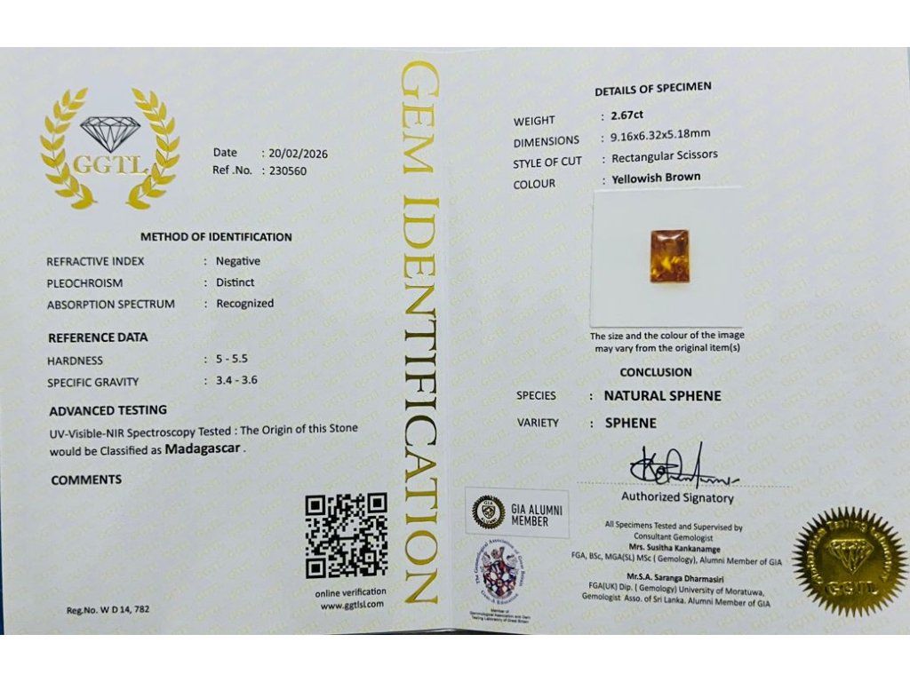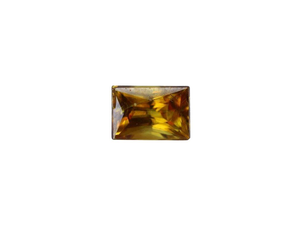 řírodní titanít (sphene) o hmotnosti 2,67 ct zaujme svou charakteristickou žluto-hnědou barvou, která vyzařuje teplou hloubku a přirozenou intenzitu. Tento výjimečný kámen si zachovává svou autentickou krásu a silný rýs.